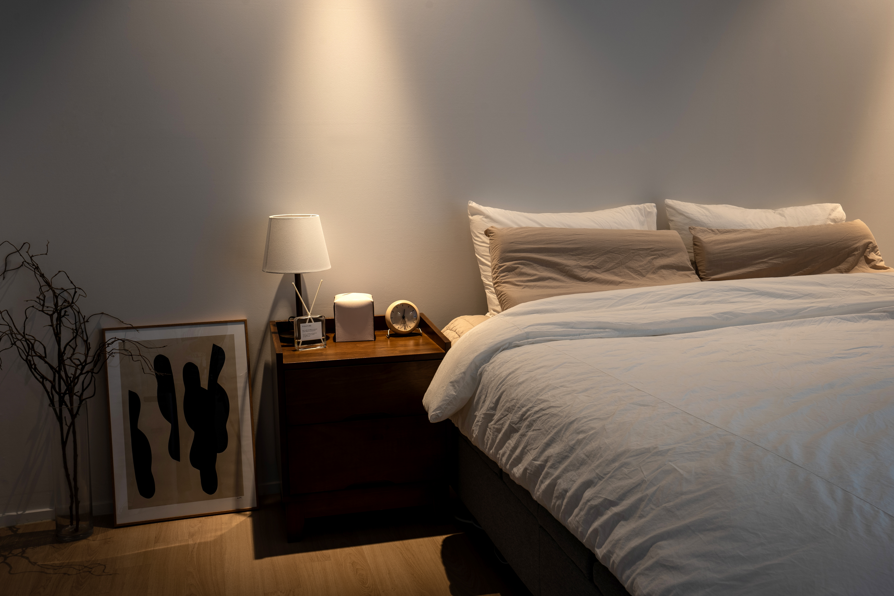 안방 인테리어의 경우 가구 컬러가 거실과 주방보다는 짙은 컬러를 선택하면서 차분한 느낌을 연출한 것 같습니다. 협탁 옆 애매한 공간에 액자로 채워 주면서 공간 활용을 정말 잘하신 것 같고요. 호텔 침실의 느낌을 받았습니다.