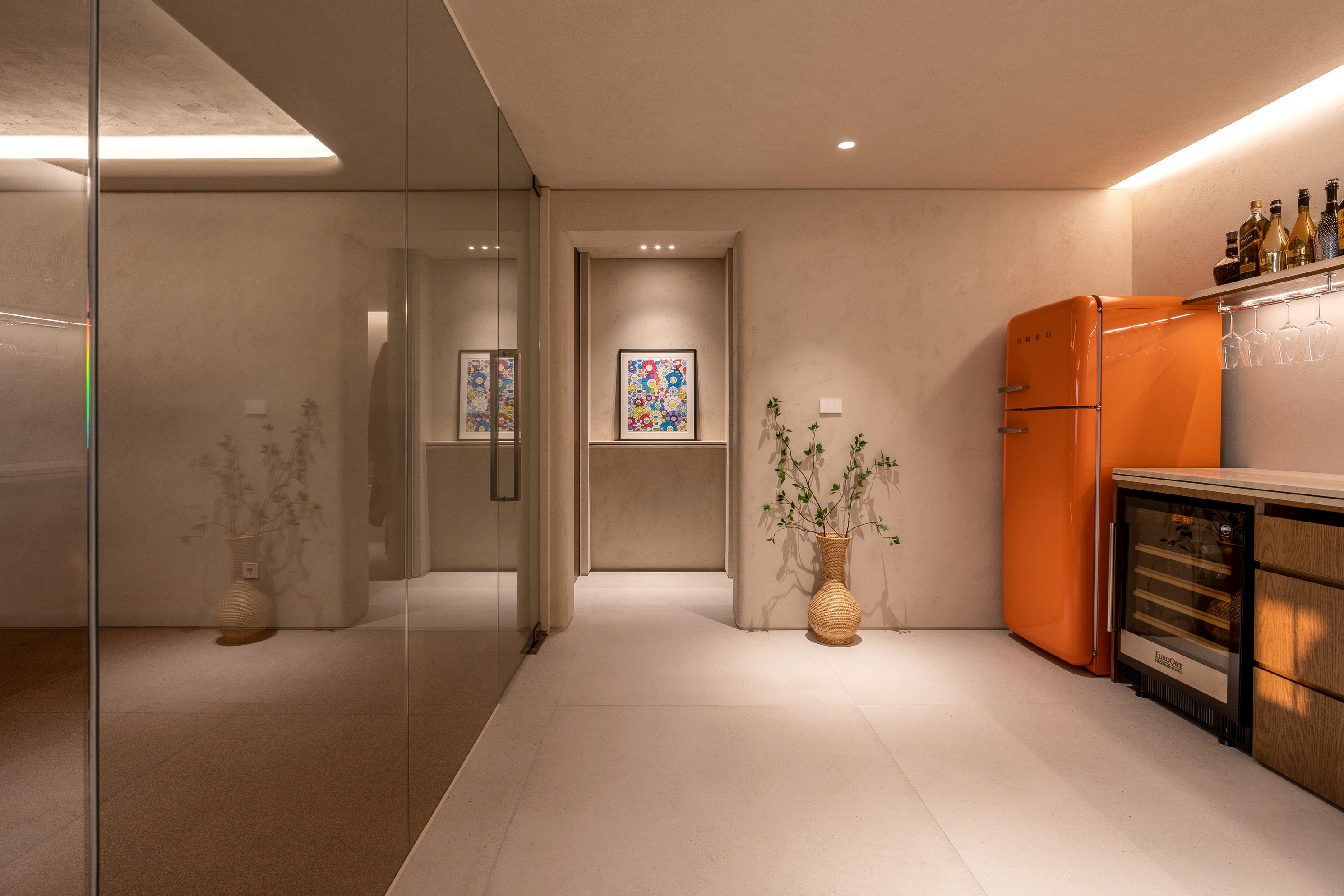 '세련된'이라는 단어를 정말 오랜만에 쓰는 것 같은데요. 와인바 인테리어 라고하면 우리가 늘 생각했던 그런, 철 지난 옷을 억지로 입은듯한 느낌이 드는 것이 평균적이지만 이번 현장은 전혀 그렇지 않은 정말 세련된 디자인이었습니다. 와인바 인듯 미니 주방인 듯 하지만 특징을 뚜렷하게 품은 공간이었습니다. 냉장고의 컬러는 무난할 수 있었던 공간의 포인트 역할을 하는 것 같습니다.