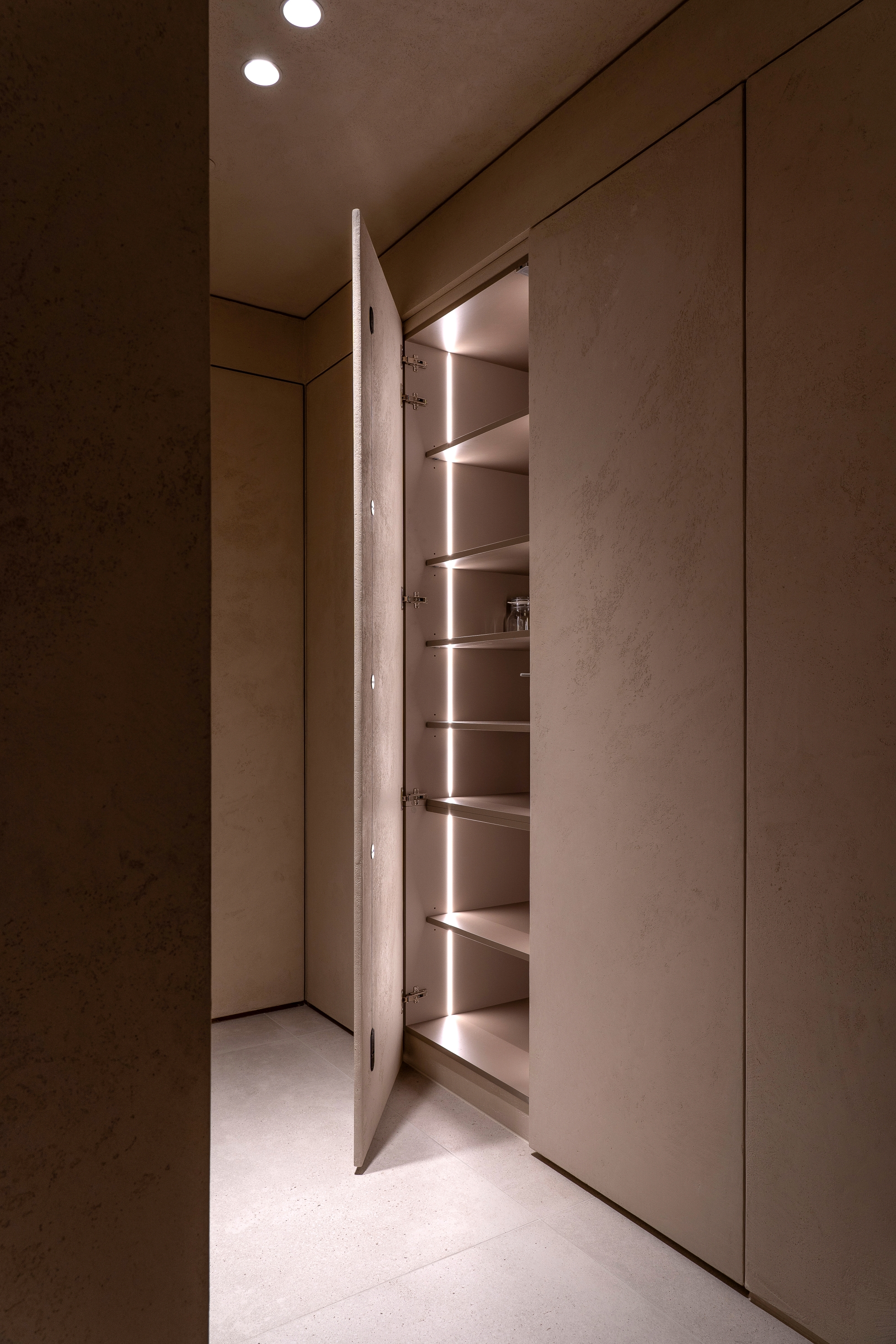 주방의 숨겨진 공간입니다. 모든 공간을 통하는 문은 히든도어 방식을 적용하여 깔끔함을 보였습니다. 선반의 매립조명은 작은 부분 하나하나를 놓치지 않은 섬세함을 느낄 수 있었습니다.