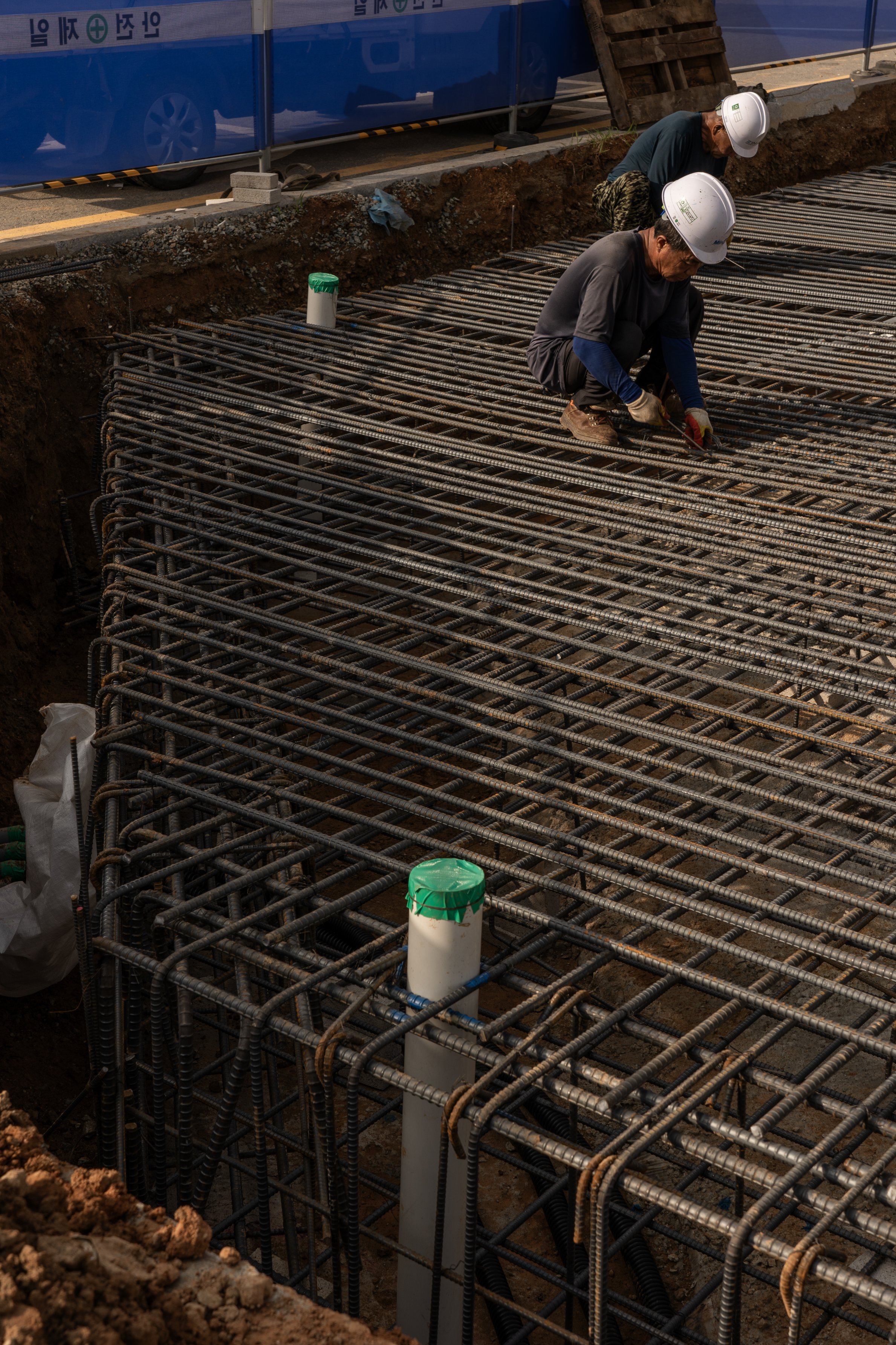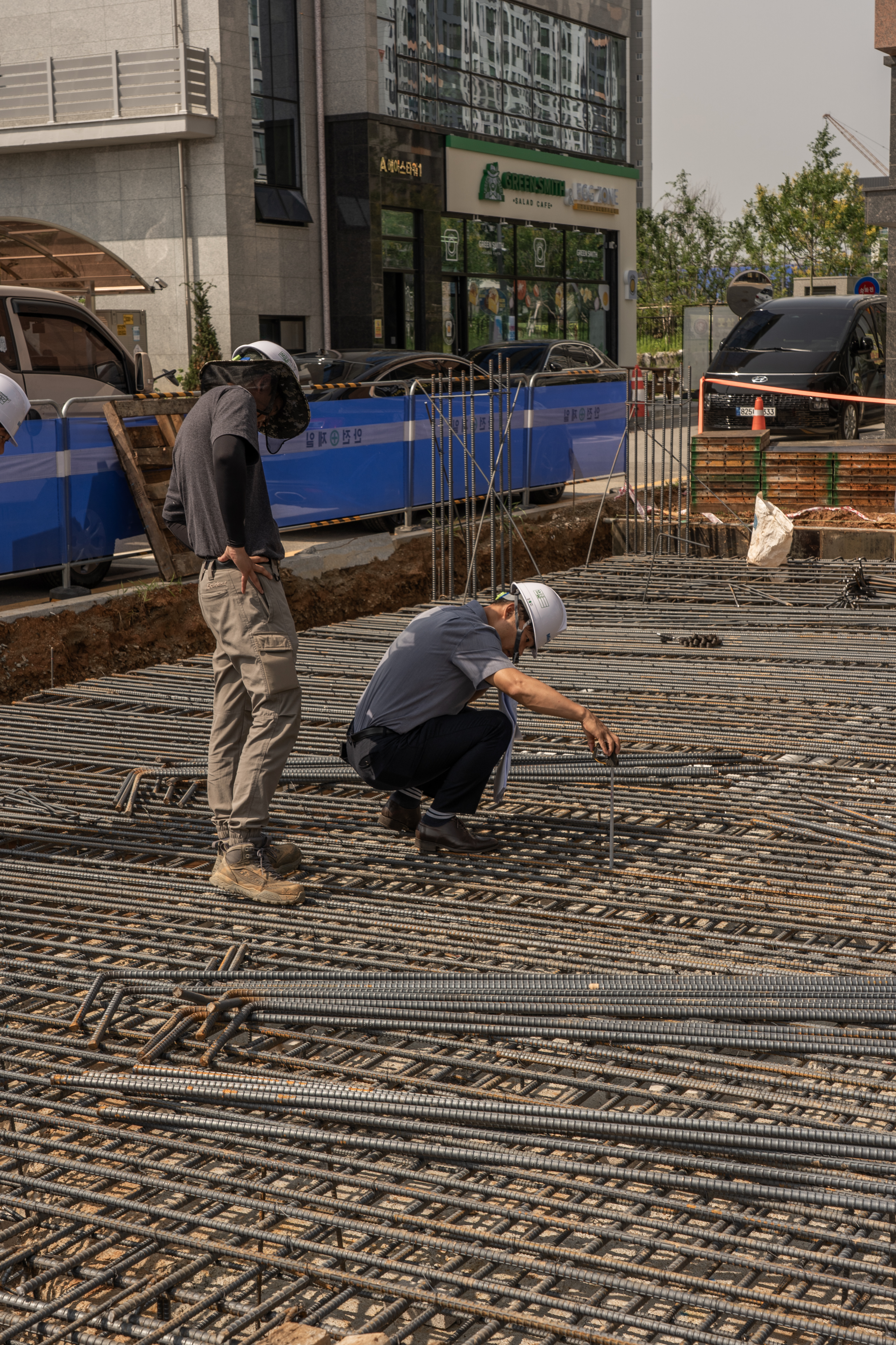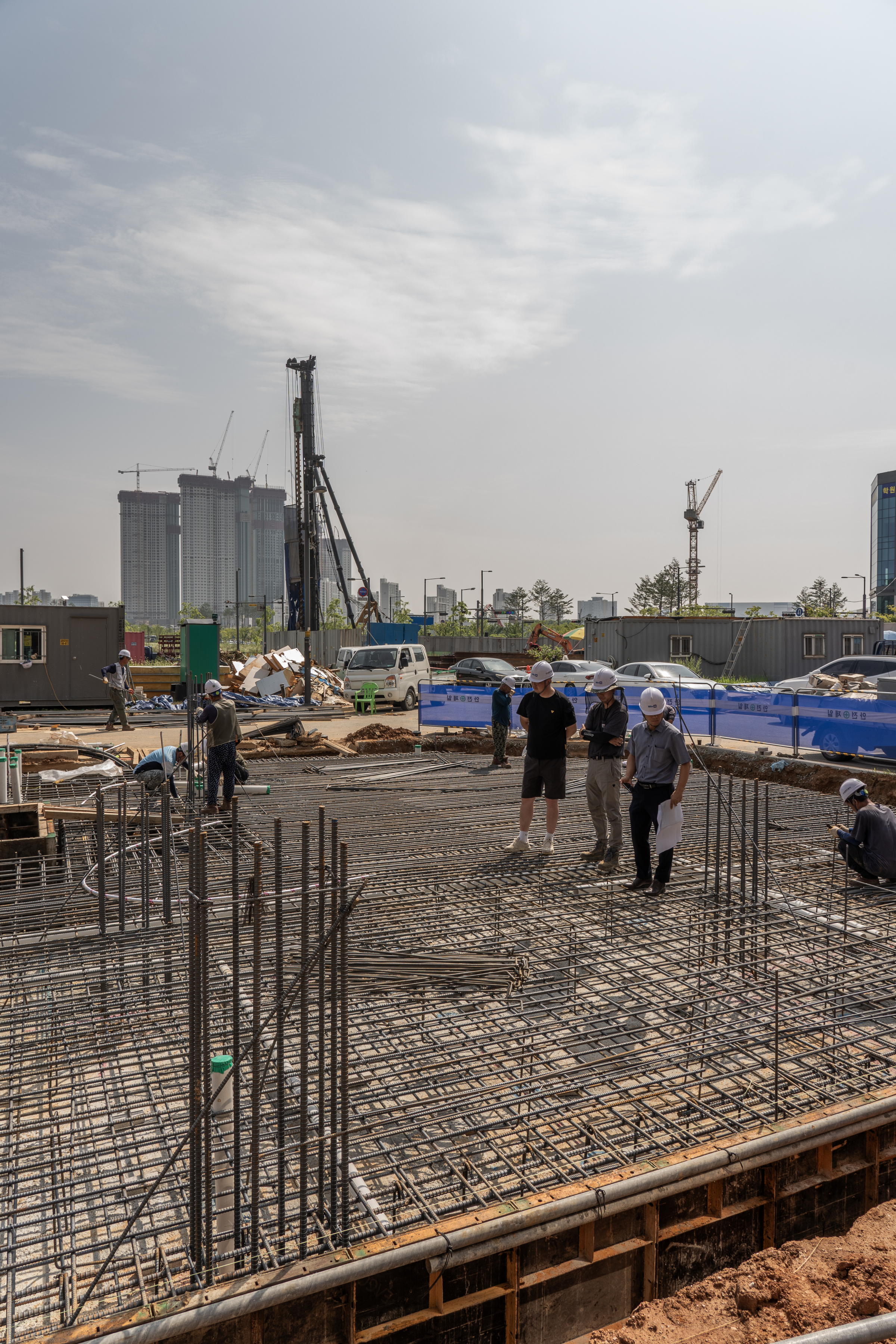 버림 콘크리트 시공이 완료되고 나면 기초 토목공사가 진행되는데요. 기초공사 순서에는 먹 매김(먹줄놓기)으로 기둥이 놓일 자리와 기둥의 하중을 받쳐줄 기초철근배근 위치를 체크하여 철근을 배근하기 시작합니다. 철근 배근은 설계부터 정해진 철근의 두께와 간격에 맞춰 시공합니다.