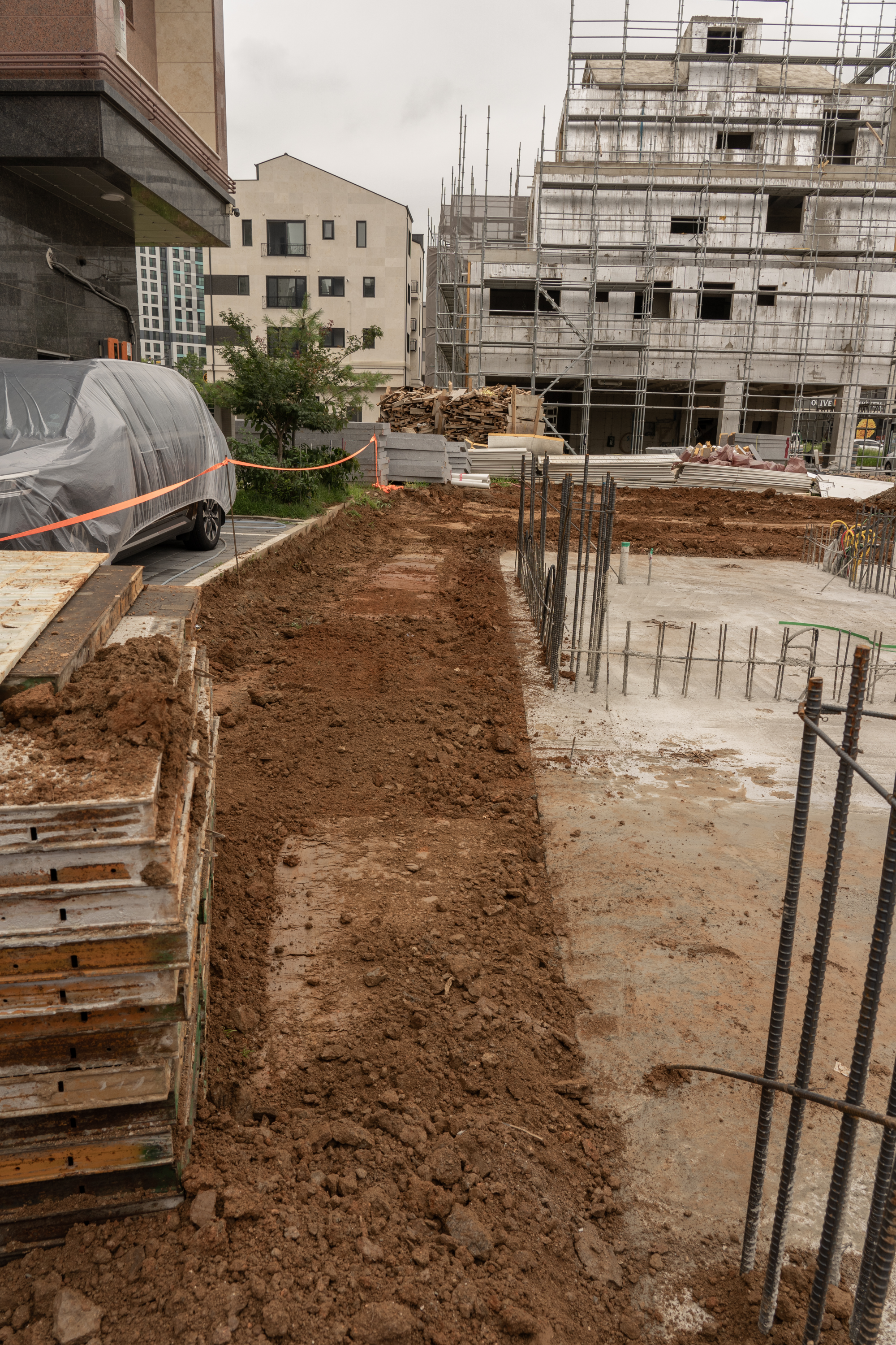 그렇듯 기초공사 틀 주변부 되메우기 시 흙을 채우고 단단하게 다져 지내력을 높이는 것에 신경 써야 하며 빗물 배수(물 빠짐)가 잘 이루어져야 합니다. 이것은 빗물 고임으로 발생하는 지반침하와 안전사고를 사전에 예방할 수 있는 가장 기본적인 내용입니다.
